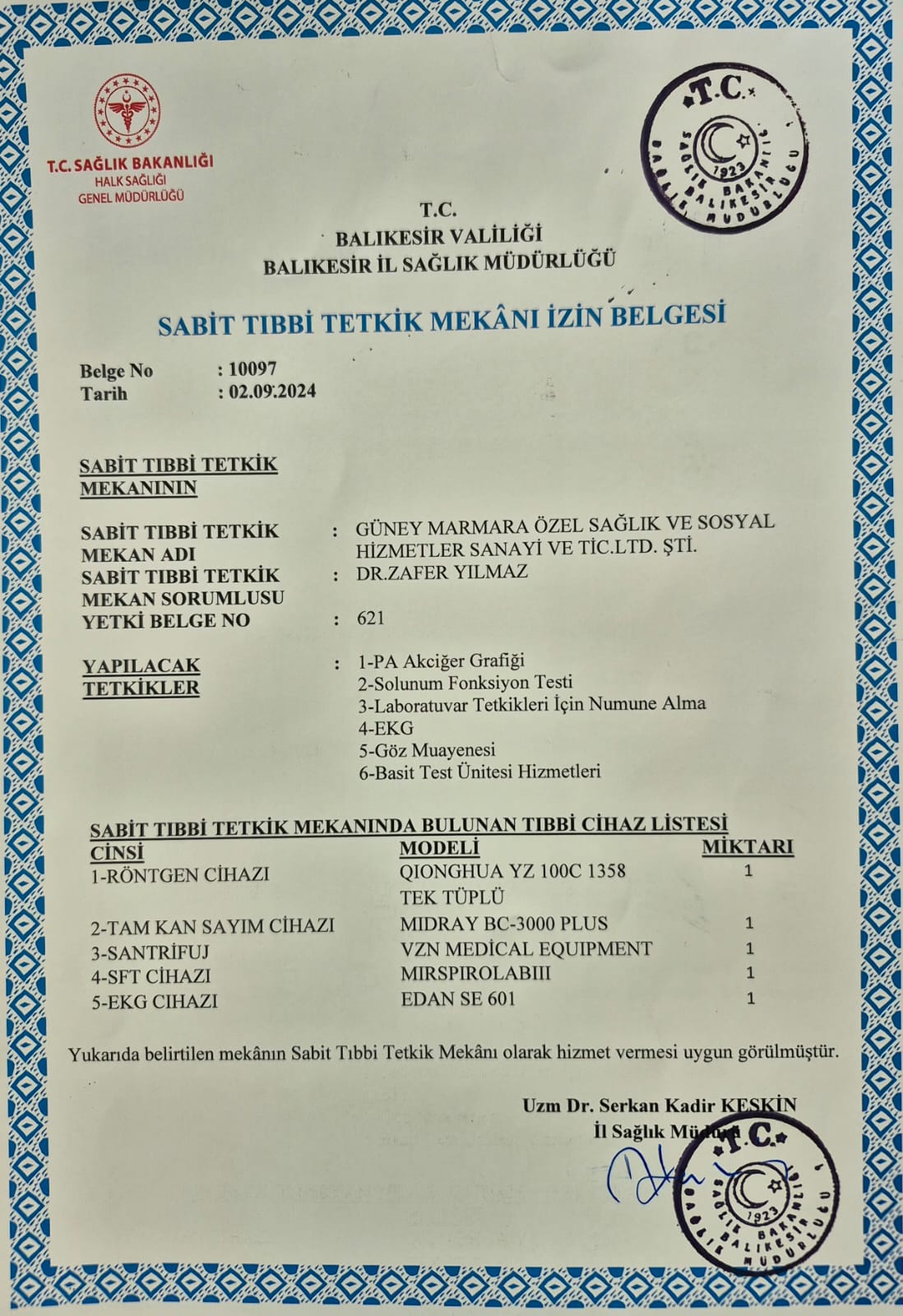 Sabit tıbbi tetkik mekanı yetkisi alarak akciğer grafisi, solunum fonksiyon testi, EKG ve numune alma gibi basit tıbbi tetkik hizmet laboratuvarı hizmeti vermekteyiz.